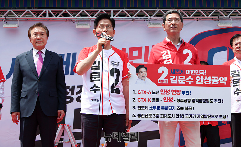 김문수 국민의힘 대선 후보가 6.3 대통령 선거를 앞둔 26일 오전 경기 안성중앙시장 서인사거리에서 열린 유세현장에서 지지를 호소하고 있다.