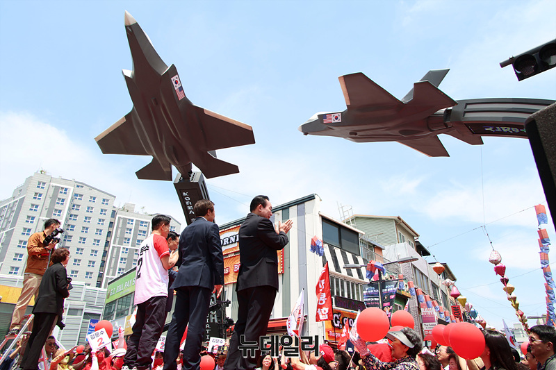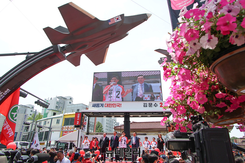 김문수 국민의힘 대선 후보가 6.3 대통령 선거를 앞둔 26일 오전 경기 평택시 오산공군기지 정문 앞에서 열린 유세현장에서 지지를 호소하고 있다.