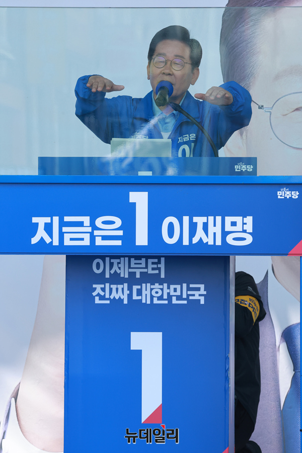 이재명 더불어민주당 대통령 후보가 26일 오후 경기 수원시 팔달문 영동시장 입구에서 열린 유세에서 지지를 호소하고 있다. (경기 수원=이종현 기자)