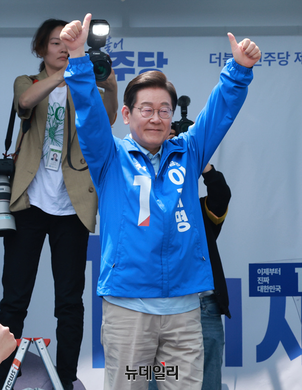 이재명 더불어민주당 대통령 후보가 26일 오후 경기 수원시 팔달문 영동시장 입구에서 열린 유세에서 지지를 호소하고 있다. (경기 수원=이종현 기자)