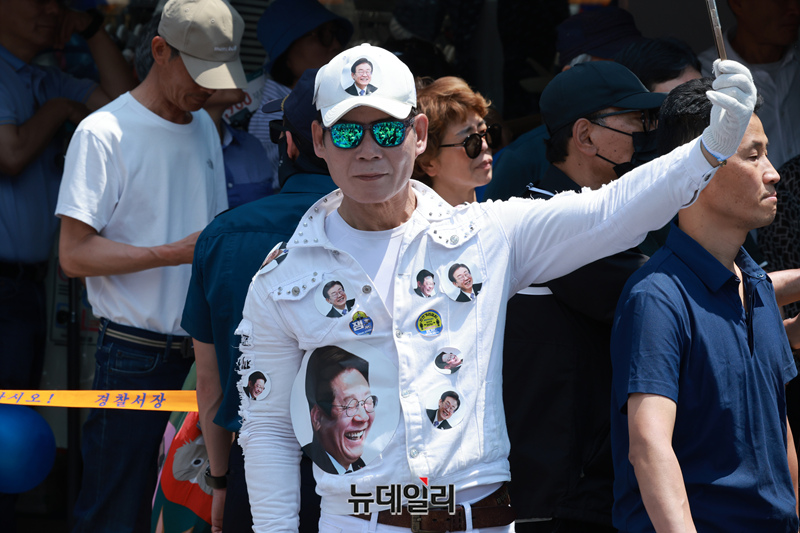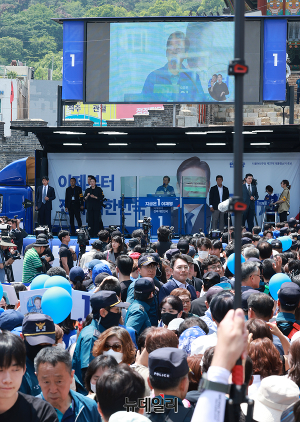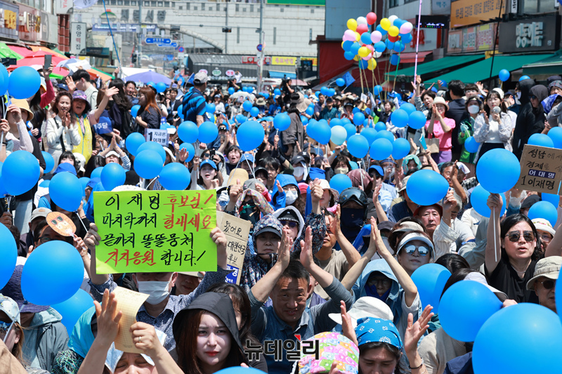 이재명 더불어민주당 대통령 후보가 26일 오후 경기 수원시 팔달문 영동시장 입구에서 열린 유세에서 지지를 호소하고 있는 가운데 지지자들이 환호하고 있다. (경기 수원=이종현 기자)