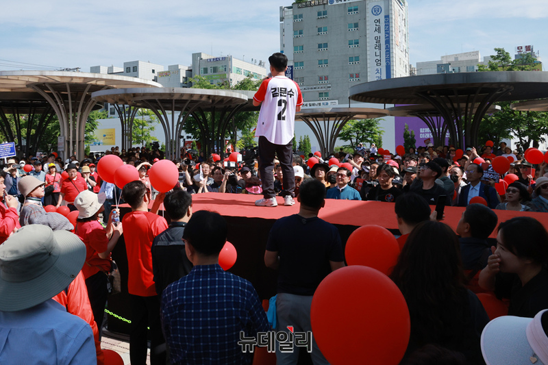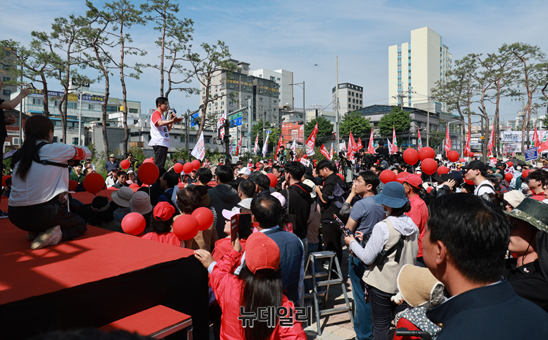 김문수 국민의힘 대선 후보가 6.3 대통령 선거를 8일 앞둔 26일 경기 오산역광장 유세에서 지지를 호소 하고 있다. (경기 오산=이종현 기자)