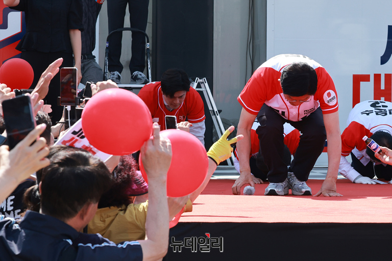 김문수 국민의힘 대선 후보가 6.3 대통령 선거를 8일 앞둔 26일 경기 오산역광장 유세에서 큰절을 하는 중 한 지지자가 피로회복제를 건네고 있다. (경기 오산=이종현 기자)