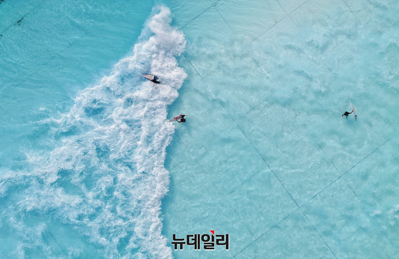 여름이 코앞으로 다가온 26일 오후 경기 시흥시 인공서핑장 웨이브파크에서 서퍼들이 파도를 타며 더위를 식히고 있다.
