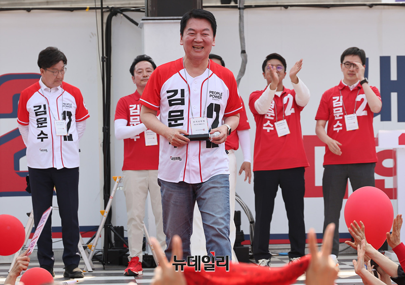 안철수 국민의힘 공동선대위원장이 26일 오후 경기 용인시 포은아트갤러리 광장에서 열린 김문수 국민의힘 대선 후보 집중유세서 찬조연설을 하고 있다.