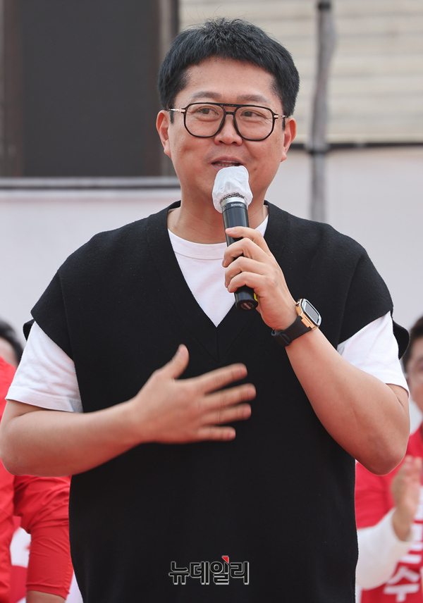 개그맨 신동수가 26일 오후 경기 용인시 포은아트갤러리 광장에서 열린 김문수 국민의힘 대선 후보 집중유세에서 찬조연설을 하고 있다.