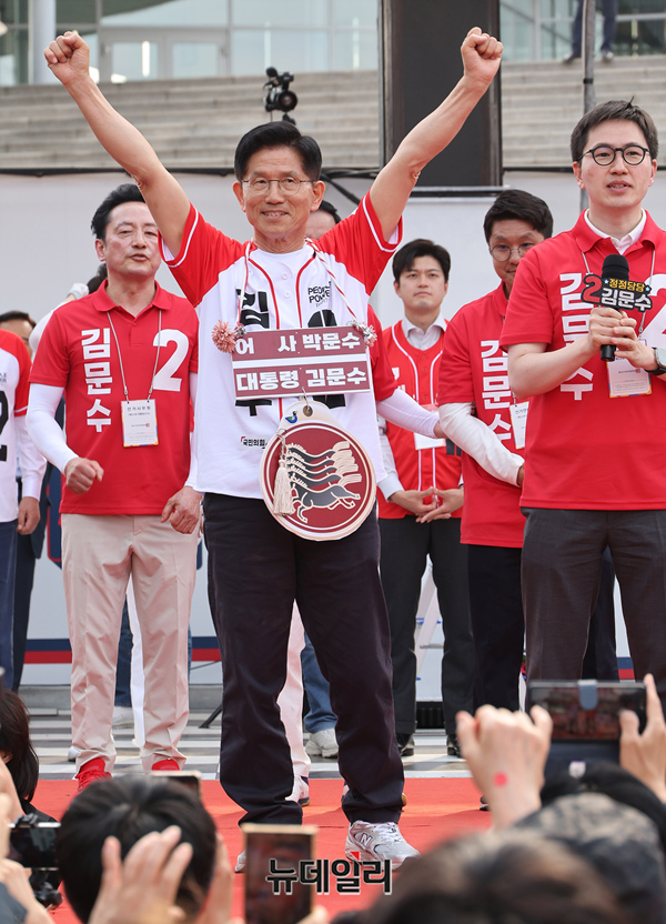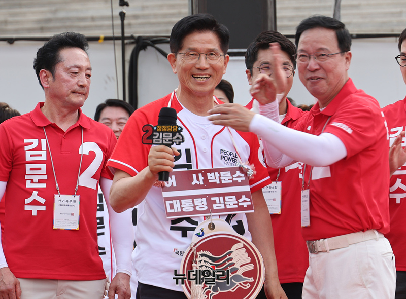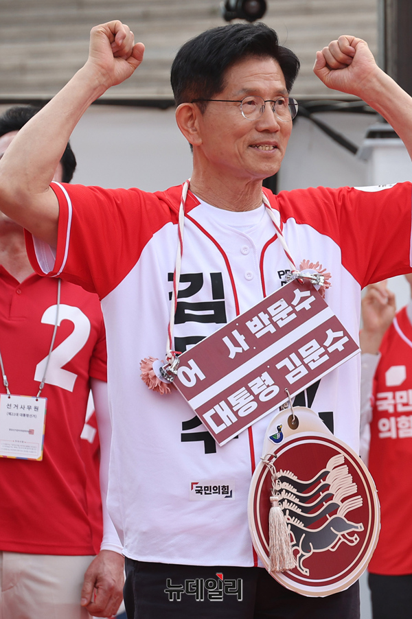 김문수 국민의힘 대선 후보가 26일 오후 경기 용인시 포은아트갤러리 광장에서 열린 집중유세에서 고석 당협위원장이 준 마패를 걸고 포즈를 취하고 있다. 김 후보는 이날 경기 남부 지역을 돌며 유세를 이어가고 있다. (경기 용인=정상윤 기자)