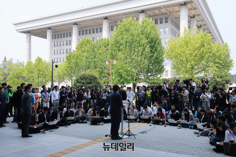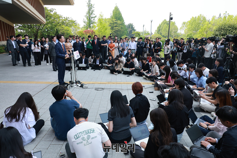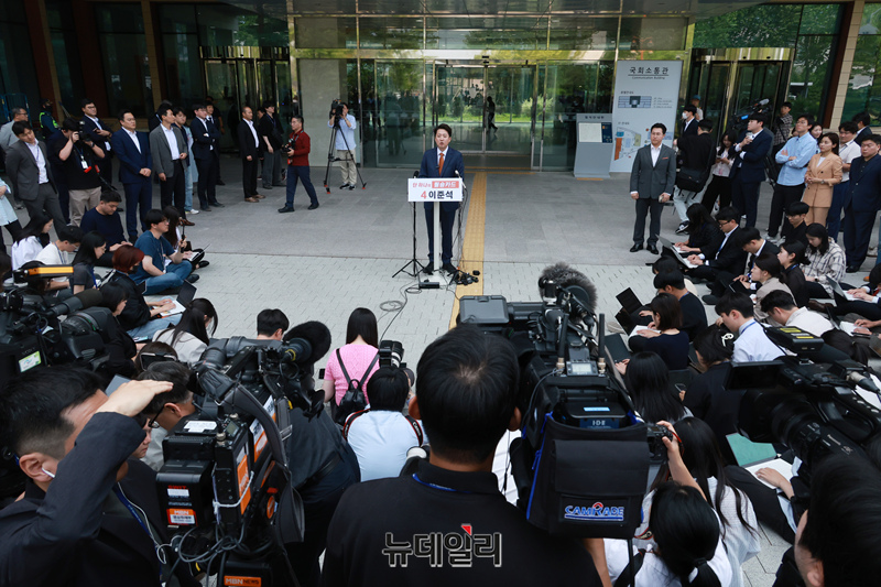 이준석 개혁신당 대통령 후보가 27일 국회 소통관 앞에서 긴급 기자회견을 갖고 있다.