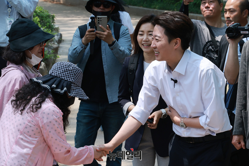 이준석 개혁신당 대선 후보가 28일 서울 여의도 여의도공원에서 도보유세를 하고 있다.