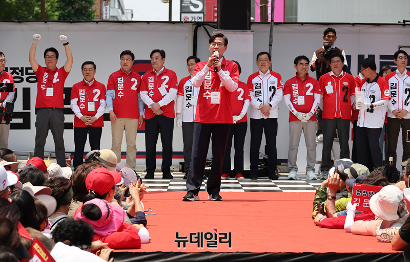 이날 김문수 후보는 롯데자이언츠 유니폼을 입고 연단에 올랐다. 김 후보는 이날 부산진구, 영남대, 대구 동성로 등 영남권을 돌며 표심잡기에 돌입한다. (부산=정상윤 기자)