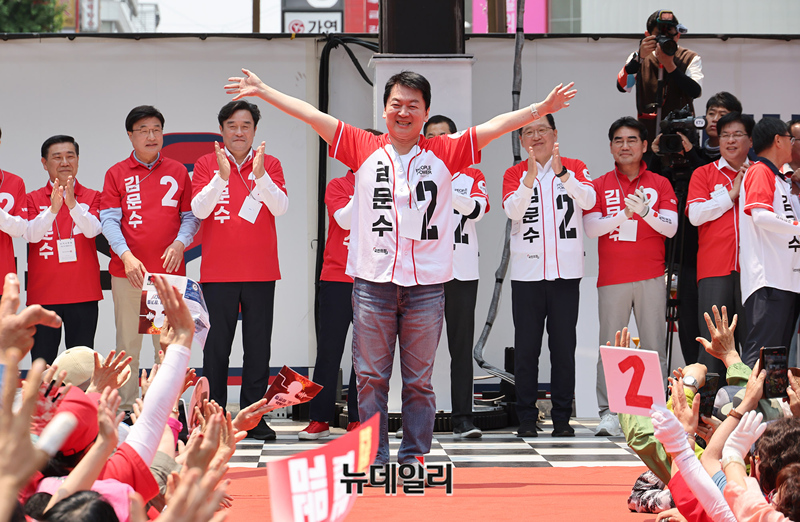 이날 김문수 후보는 롯데자이언츠 유니폼을 입고 연단에 올랐다. 김 후보는 이날 부산진구, 영남대, 대구 동성로 등 영남권을 돌며 표심잡기에 돌입한다. (부산=정상윤 기자)