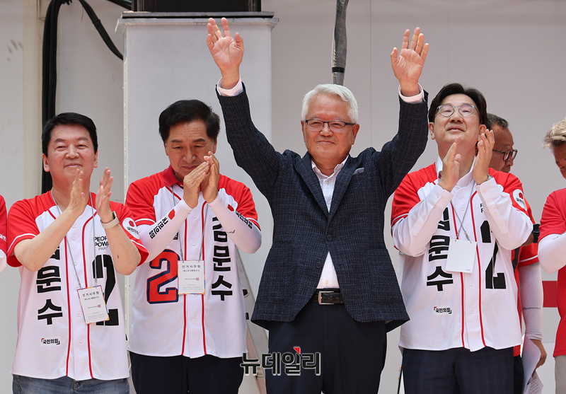 이날 김문수 후보는 롯데자이언츠 유니폼을 입고 연단에 올랐다. 김 후보는 이날 부산진구, 영남대, 대구 동성로 등 영남권을 돌며 표심잡기에 돌입한다. (부산=정상윤 기자)