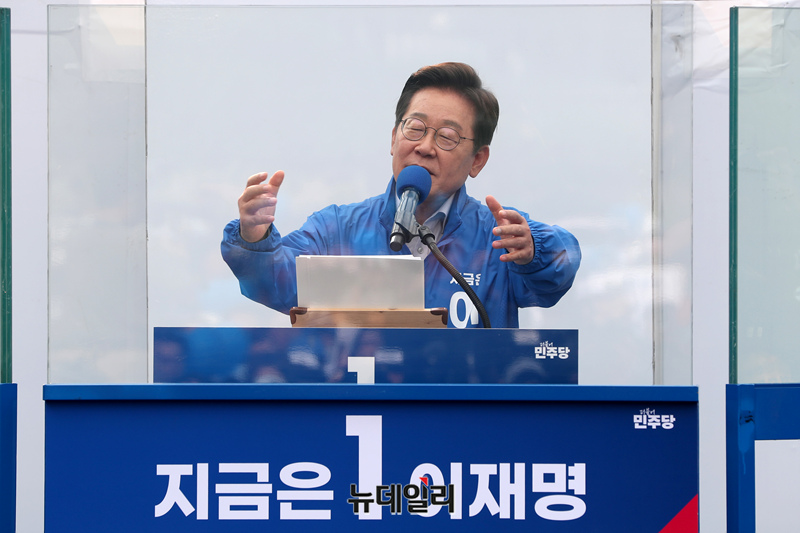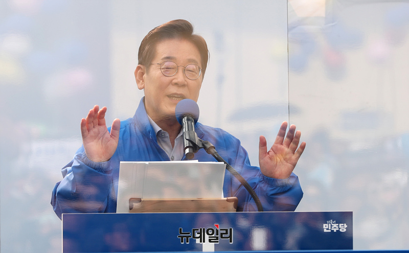 이재명 더불어민주당 대선 후보 가 28일 오후 서울 광진구 어린이대공원 앞에서 열린 유세에서 지지를 호소하고 있다.