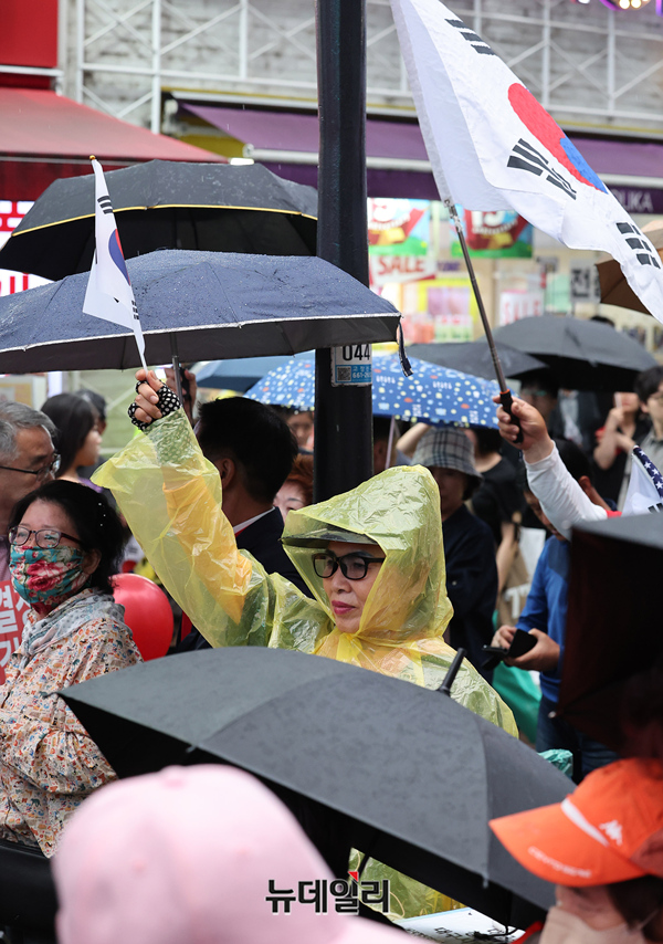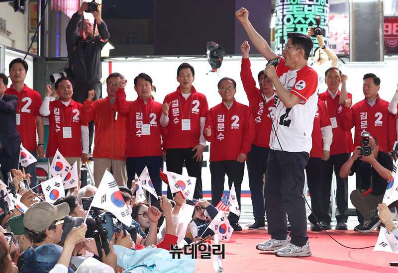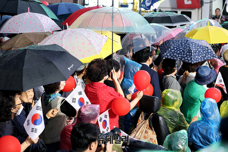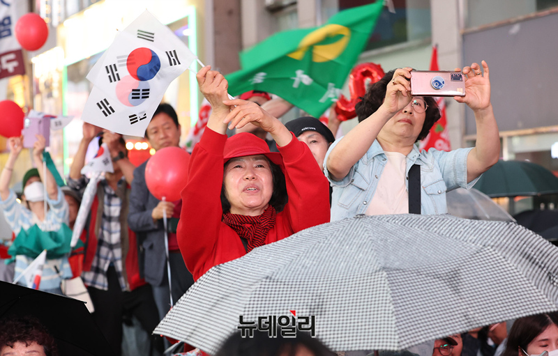 김문수 국민의힘 대선후보가 28일 마지막 공식일정으로 대구 중구 동성로에서 열린 집중유세를 이어가는 가운데 지지자들이 비를 피하기 위해 비닐봉지를 쓰고, 태극기를 흔들며 김 후보를 맞고 있다.
