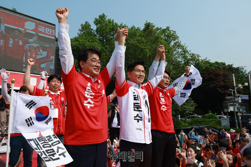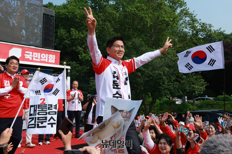 21대 대통령 선거 사전투표 첫 날인 29일 김문수 국민의힘 대통령 후보가 인천 중구 자유공원에서 열린 유세에서 지지를 호소하고 있다. (인천=이종현 기자)