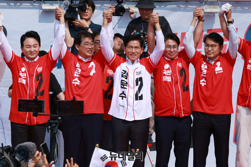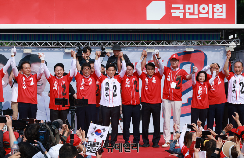 21대 대통령 선거 사전투표 첫 날인 29일 김문수 국민의힘 대통령 후보가 인천 중구 자유공원에서 열린 유세에서 참석자들과 손들어 인사하고 있다. (인천=이종현 기자)