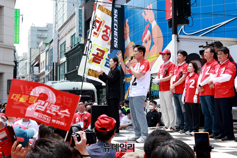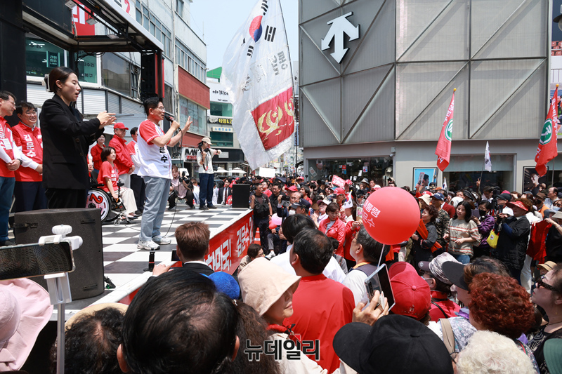 21대 대통령 선거 사전투표 첫 날인 29일 김문수 국민의힘 대통령 후보가 인천 부평 문화의거리 인근에서 열린 집중유세에서 손을 들어 인사하고 있다.(인천=이종현 기자)