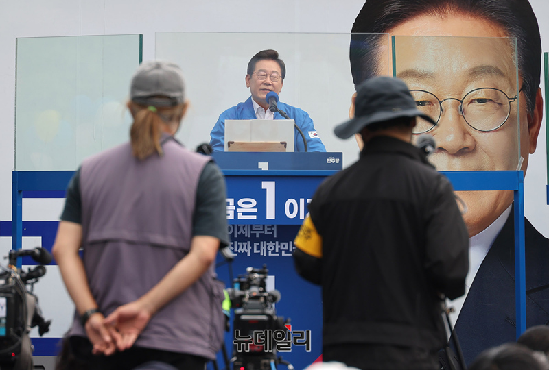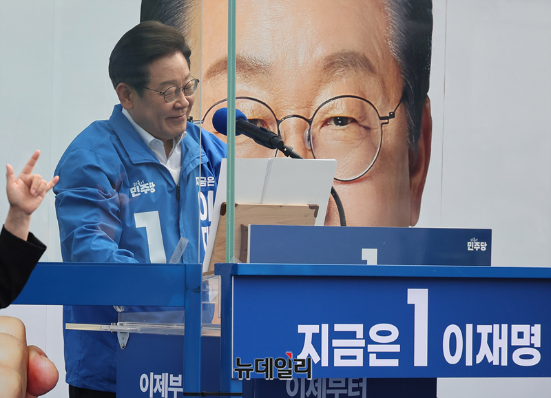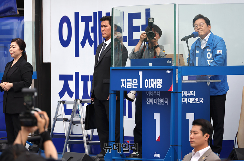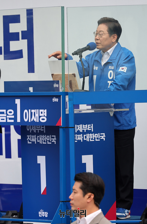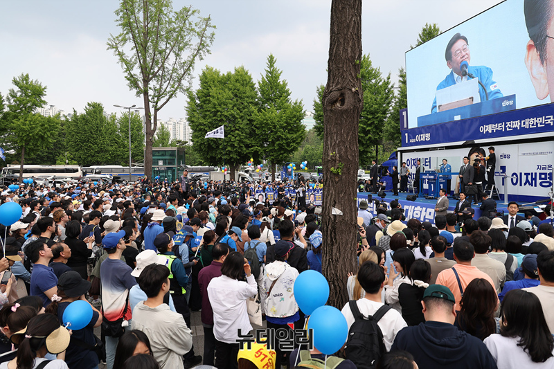 이재명 더불어민주당 대선 후보가 29일 오후 서울 송파구 잠실야구장 광장에서 열린 서울 강동·송파 집중유세에서 내란 종식을 주장하며 지지호소를 하고 있다.