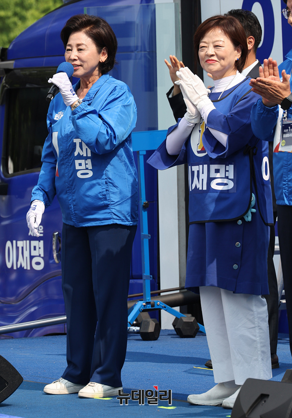 남인순, 진선미 민주당 의원이 29일 오후 서울 송파구 잠실야구장 광장에서 열린 이재명 대선후보 서울 강동·송파 집중유세에서 지지호소를 하고 있다.