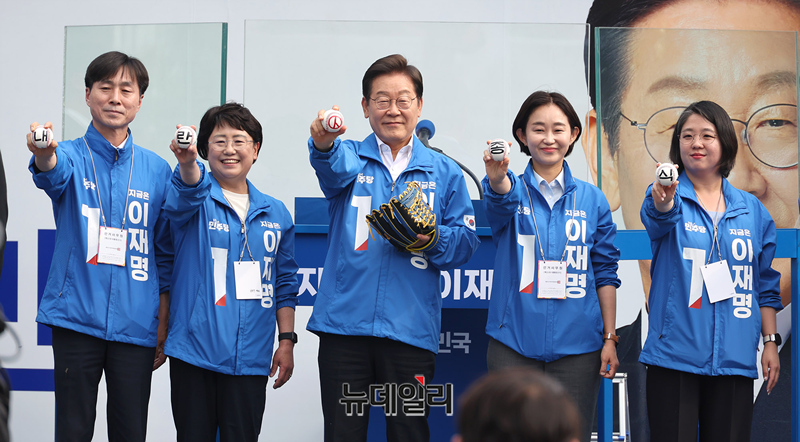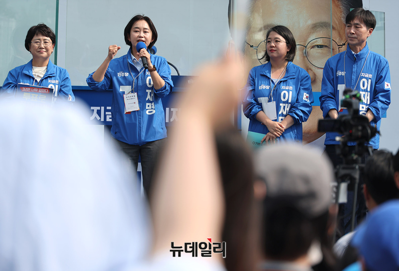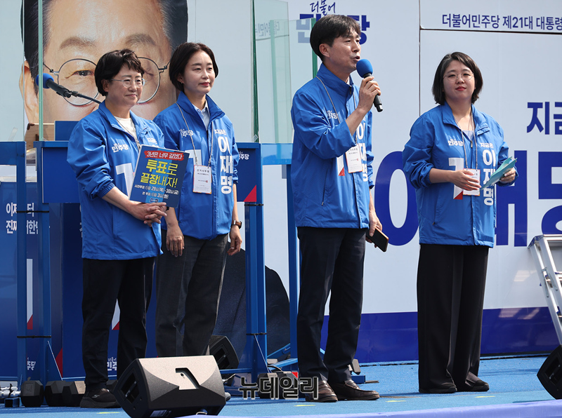 이재명 민주당 대선후보가 29일 오후 서울 송파구 잠실야구장 광장에서 열린 서울 강동·송파 집중유세에서 김재연 진보당 상임대표와 악수를 나누고 있다. 이날 유세장엔 이 후보를 지지한 조국혁신당, 기본소득당, 사회민주당, 진보당 등 야4당 대표가 참석했다.
