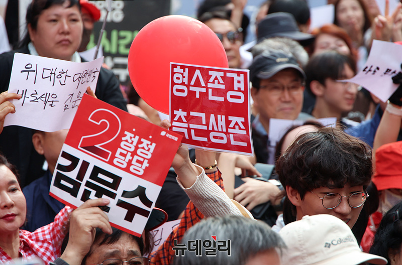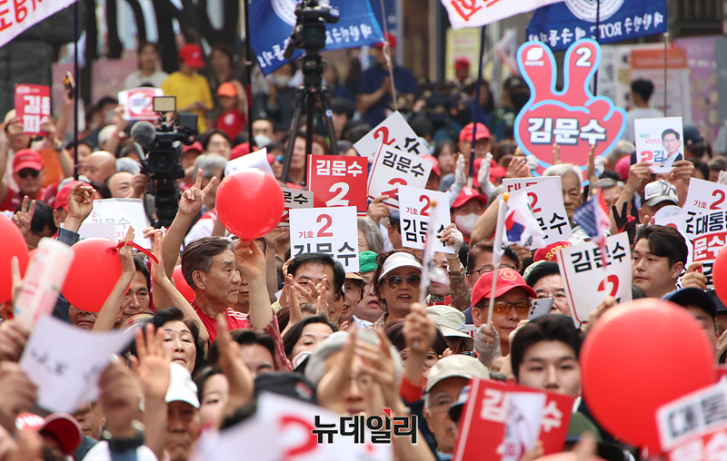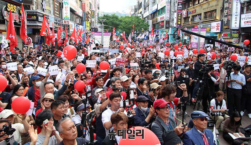 제21대 대통령 선거 사전투표 첫날인 29일 오후 경기 안양시 범계로데오거리에서 열린 김문수 국민의힘 대선 후보 유세현장이 지지자들로 가득 차 있다. (경기 안양=서성진 기자)