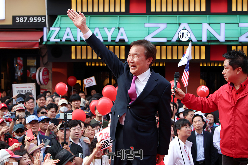 손학규 전 바른미래당 대표가 29일 오후 경기 안양시 범계로데오거리에서 열린 김문수 국민의힘 대선 후보 유세현장에서 지지를 호소하고 있다. (경기 안양=서성진 기자)