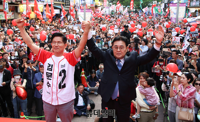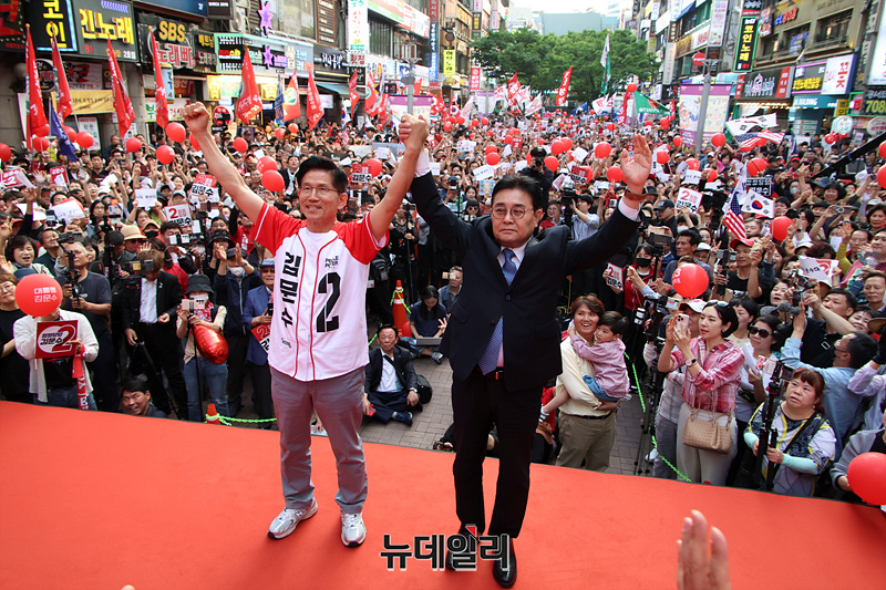 김문수 국민의힘 대선 후보와 전병헌 새미래민주당 대표가 29일 오후 경기 안양시 범계로데오거리에서 열린 유세현장에서 포즈를 취하고 있다. (경기 안양=서성진 기자)