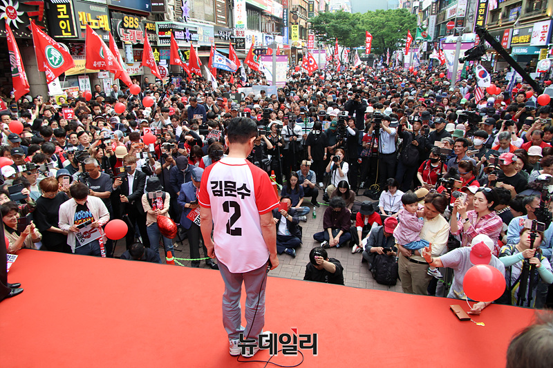 김문수 국민의힘 대선 후보가 29일 오후 경기 안양시 범계로데오거리에서 열린 유세현장에서 해군 초계기 추락사고 희생자에 대해 묵념하고 있다. (경기 안양=서성진 기자)