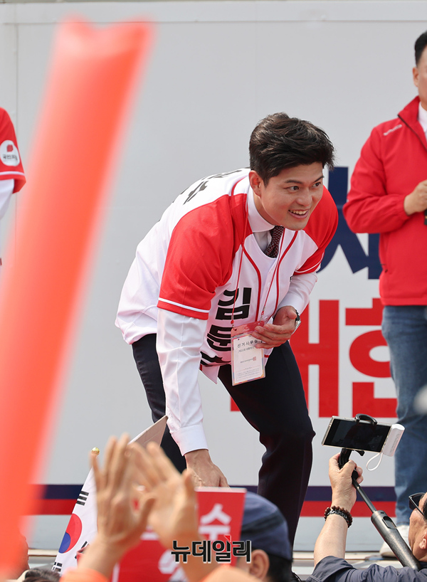 김용태 국민의힘 비대위원장이 사전투표 마지막날인 30일 오전 경기 가평군 청평시계탑광장에서 열린 김문수 국민의힘 대선 후보 유세에서 인사말을 하고 있다.