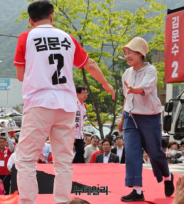 차명진 전 의원의 배우자 서명희 여사가 사전투표 마지막날인 30일 오전 경기 가평군 청평시계탑광장에서 열린 김문수 국민의힘 대선 후보 유세장에서 김 후보의 소개를 받고 있다.