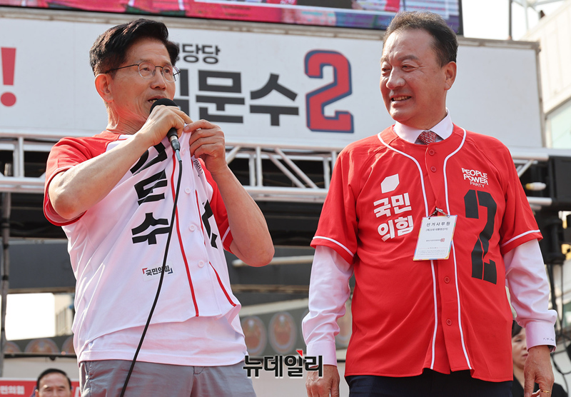 엄태영 국민의힘 의원이 사전투표 마지막 날인 30일 오후 충북 제천시 제천중앙시장에서 열린 김문수 대통령 후보 유세에서 김 후보와 손을 잡고 시민들에게 인사 하고 있다.