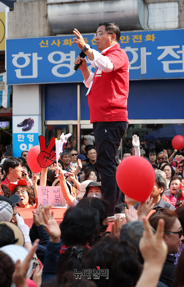이상휘 국민의힘 의원이 사전투표 마지막 날인 30일 오후 충북 제천시 제천중앙시장에서 열린 김문수 대통령 후보 유세에서 지지호소를 하고 있다.