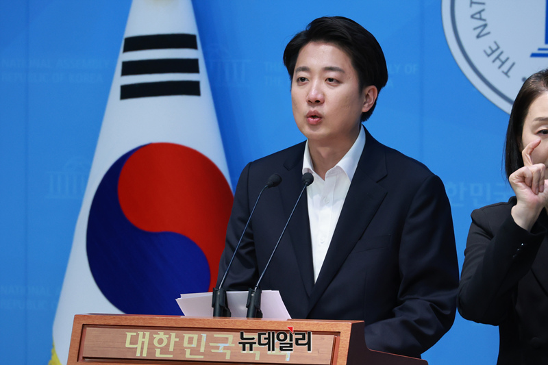 이준석 개혁신당 대통령 후보가 30일 오후 서울 여의도 국회 소통관에서 민주당 의원들이 자신을 국회에서 제명시키는 징계안을 제출한 것과 관련 긴급 기자회견을 갖고 있다.