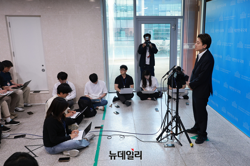 이준석 개혁신당 대통령 후보가 30일 오후 서울 여의도 국회 소통관에서 민주당 의원들이 자신을 국회에서 제명시키는 징계안을 제출한 것과 관련 긴급 기자회견을 갖고 있다.