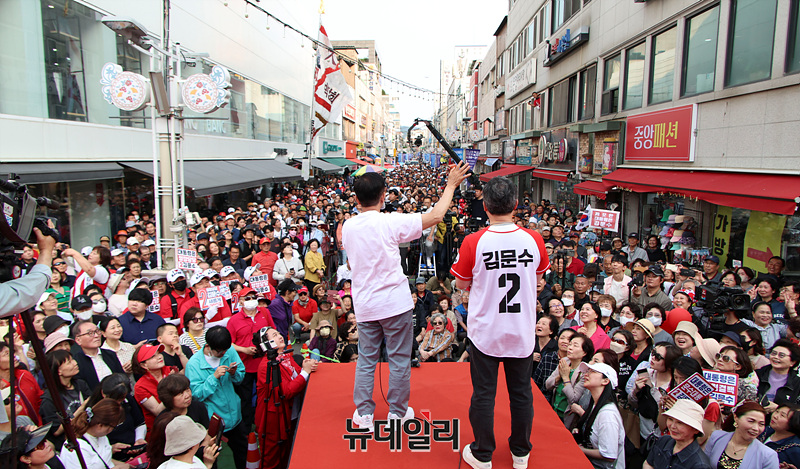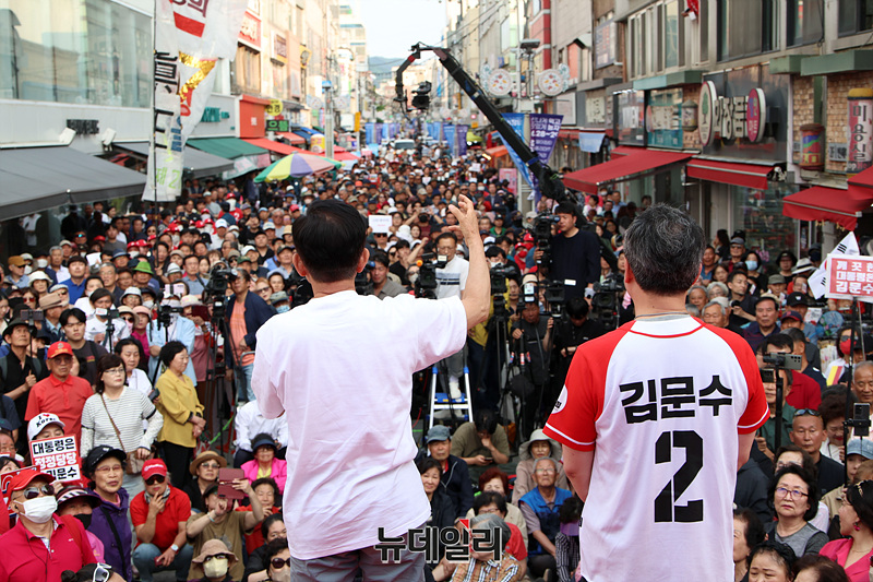 김문수 국민의힘 대선 후보가 30일 오후 강원 원주시 중앙시장에서 열린 유세현장에서 지지를 호소하고 있다. (강원 원주=서성진 기자)