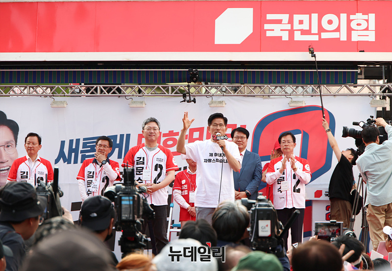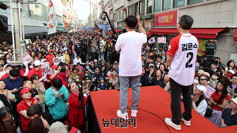 김문수 국민의힘 대선 후보가 30일 오후 강원 원주시 중앙시장에서 열린 유세현장에서 지지를 호소하고 있다. (강원 원주=서성진 기자)