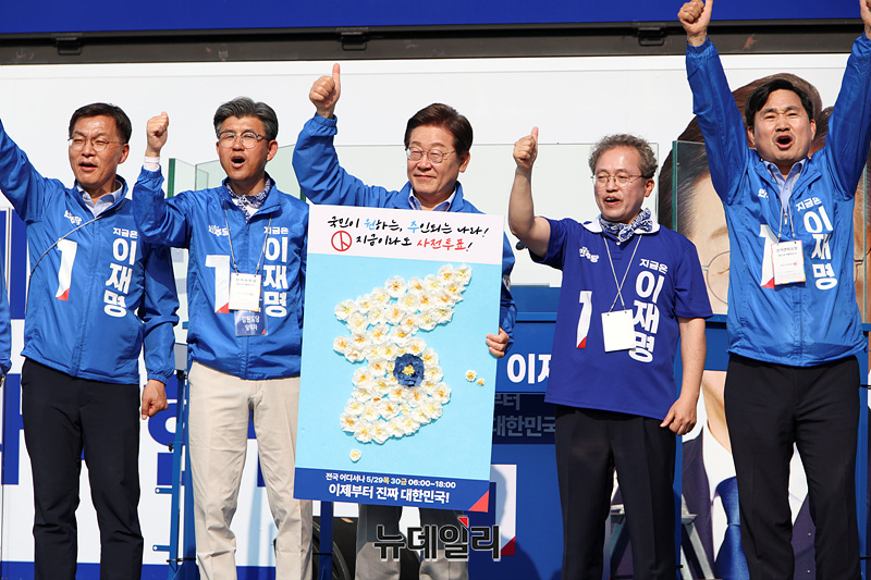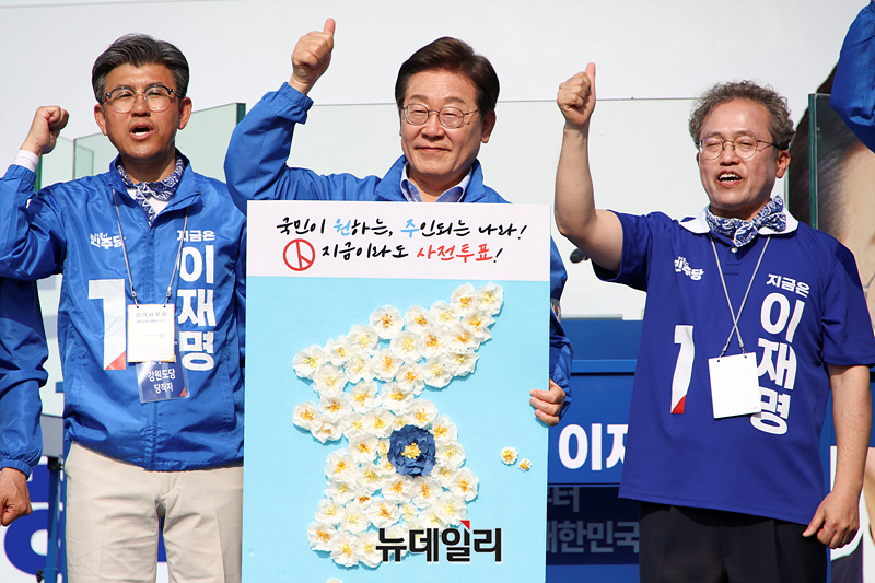 이재명 더불어민주당 대선 후보가 30일 오후 강원 원주행복마당에서 열린 유세현장에서 퍼포먼스를 하고 있다. (강원 원주=서성진 기자)