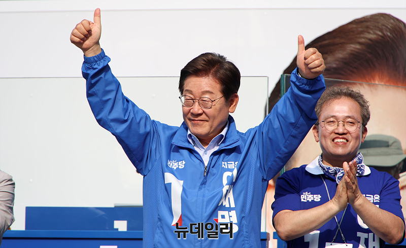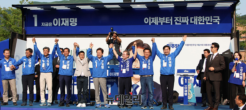 이재명 더불어민주당 대선 후보가 30일 오후 강원 원주행복마당에서 열린 유세현장에서 지지자들을 향해 인사하고 있다. (강원 원주=서성진 기자)