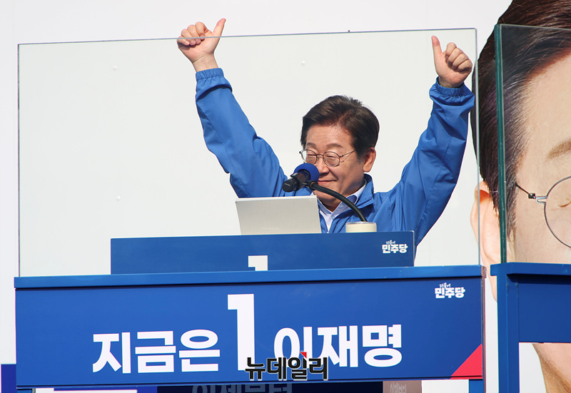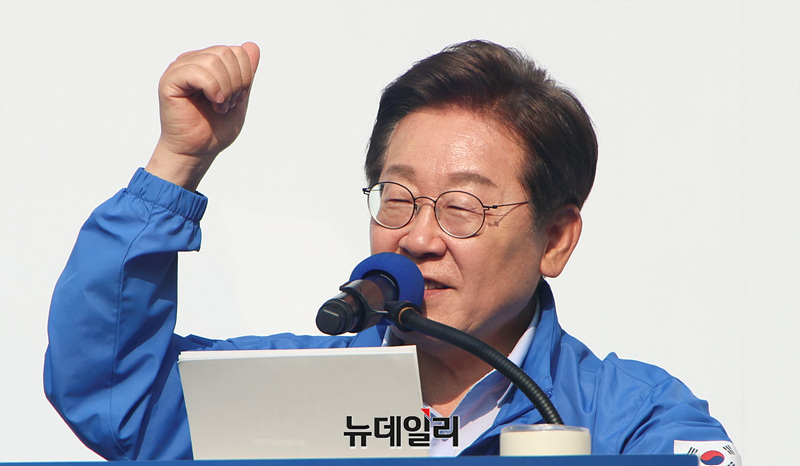 이재명 더불어민주당 대선 후보가 30일 오후 강원 원주행복마당에서 열린 유세현장에서 연단에 오르고 있다. (강원 원주=서성진 기자)