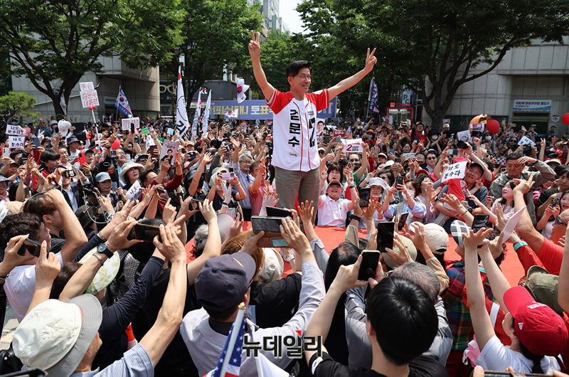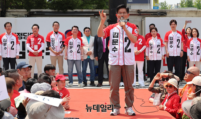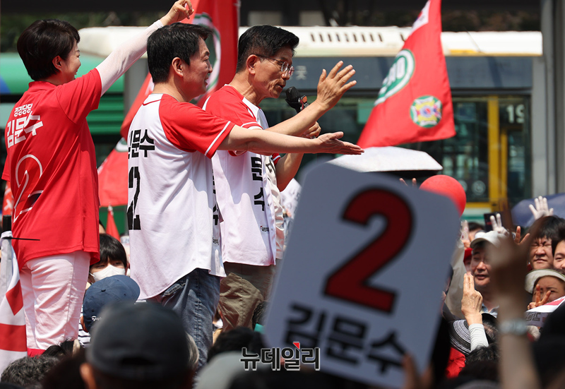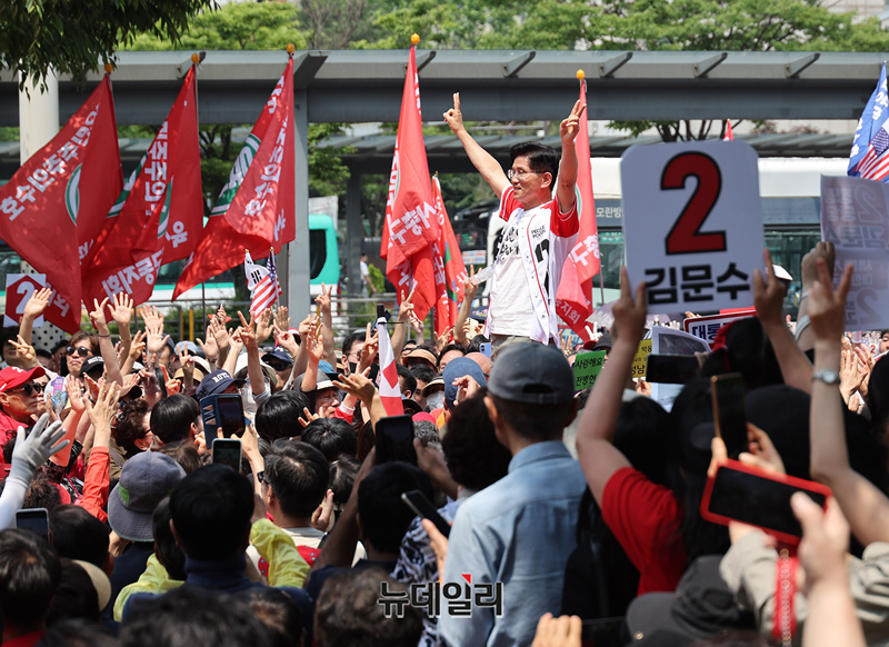 김문수 국민의힘 대통령 후보가 공식 선거운동 마지막 주말인 1일 오전 경기 성남시 야탑역광장에서 열린 유세에서 지지호소를 하고 있다. 김 후보는 이날 수도권을 돌며 마지막 표심 잡기에 나선다. (경기 성남=정상윤 기자)