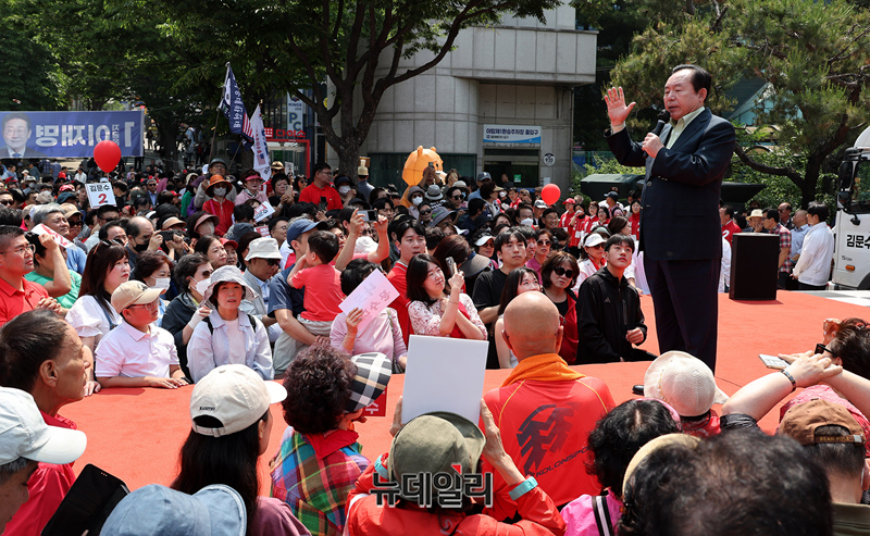 이인제 전 경기지사가 공식 선거운동 마지막 주말인 1일 오전 경기 성남시 야탑역광장에서 열린 김문수 대선후보 유세에서 지지호소를 하고 있다. 김 후보는 이날 수도권을 돌며 마지막 표심 잡기에 나선다. (경기 성남=정상윤 기자)