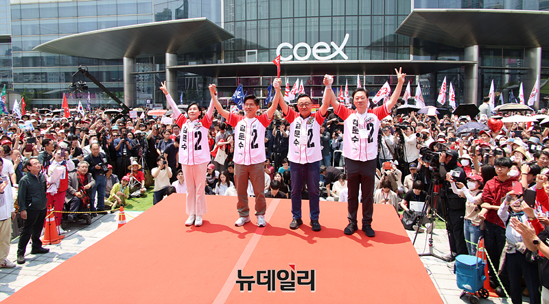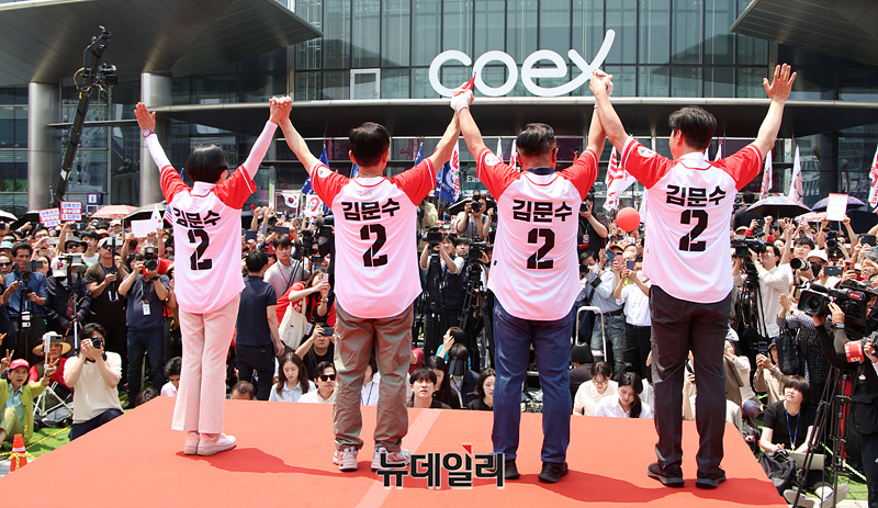 김문수 국민의힘 대선 후보가 공식 선거운동 마지막 주말인 1일 오전 서울 강남구 코엑스 앞에서 열린 유세현장에서 시민들을 향해 인사하고 있다.