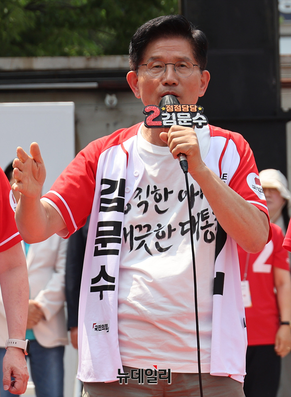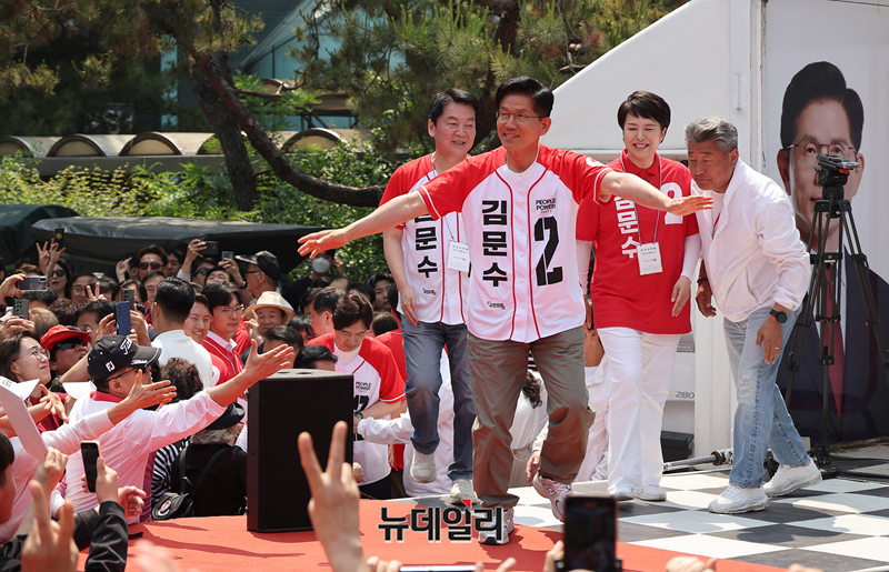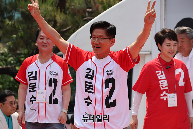 김문수 국민의힘 대통령 후보가 공식 선거운동 마지막 주말인 1일 오전 경기 성남시 야탑역광장에서 열린 유세에서 안철수, 김은혜 의원과 지지호소를 하고 있다. 김 후보는 이날 수도권을 돌며 표심잡기에 나선다. (경기 성남=정상윤 기자)