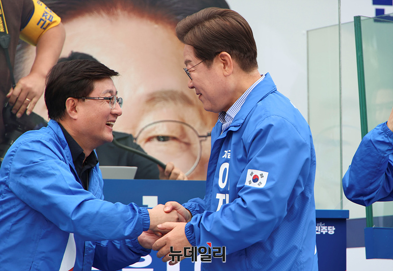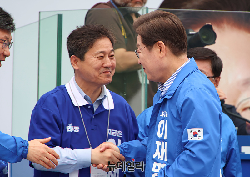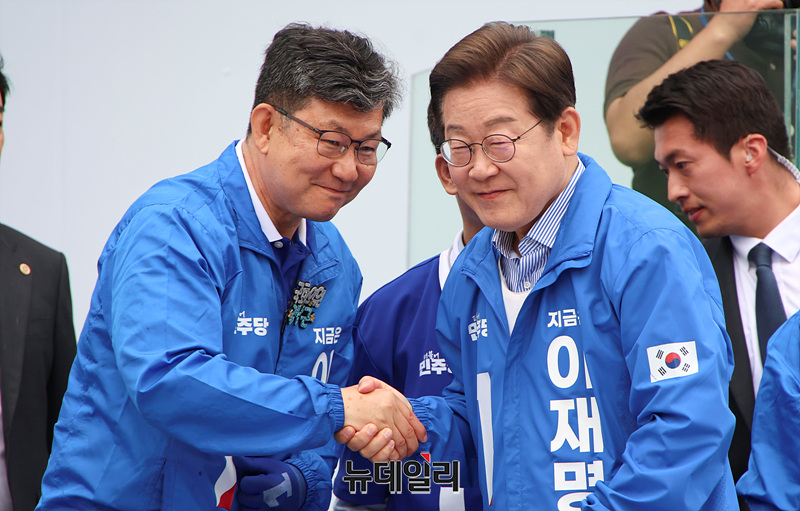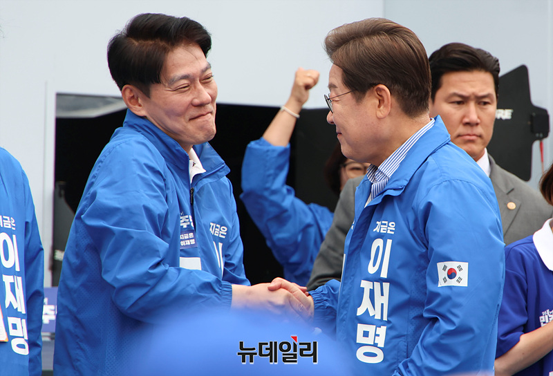 이재명 더불어민주당 대선 후보가 제21대 대통령 선거를 하루 앞둔 2일 오전 서울 강북구 북서울꿈의숲 서문광장에서 열린 유세현장에서 악수를 나누고 있다.