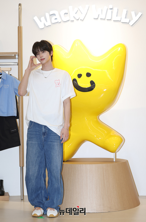 TWS(투어스) 신유가 2일 오전 서울 중구 와키윌리 서울 플래그십 스토어에서 열린 오픈 기념 행사에서 포즈를 취하고 있다. 캐주얼 브랜드 와키윌리는 홍대점에 이어 명동에 두 번째 플래그십 스토어를 오픈했다.
