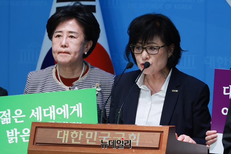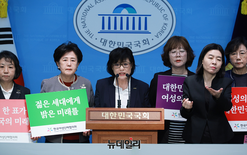 허명 한국여성단체협의회 회장이 2일 오전 국회 소통관에서 기자회견을 갖고 유시민 작가의 발언을 규탄하고 있다.
