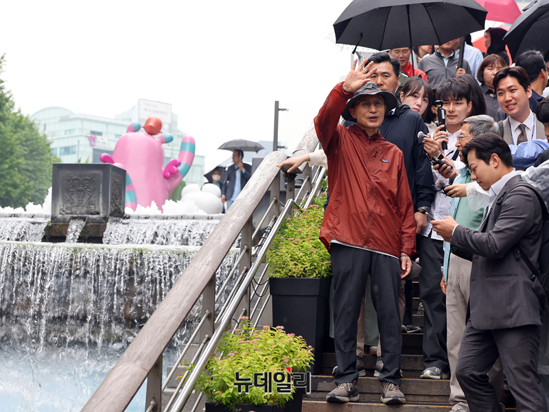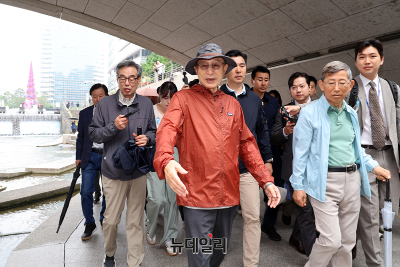 이명박 전 대통령이 제21대 대통령선거를 하루 앞둔 2일 오후 서울 종로구 청계천을 산책하며 시민들에게 인사하고 있다.