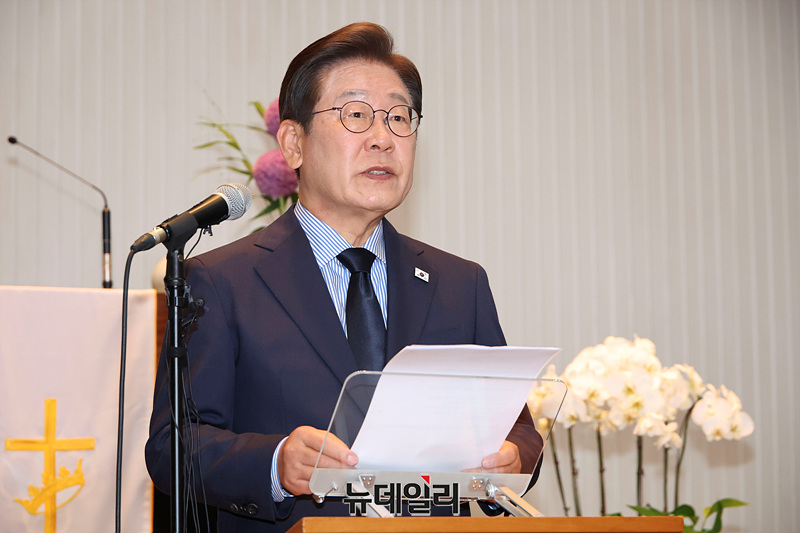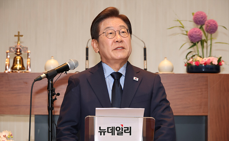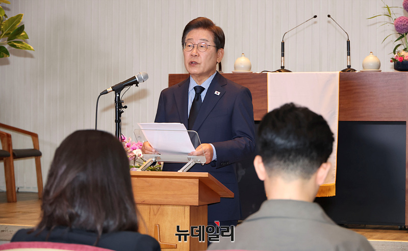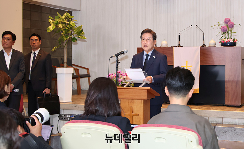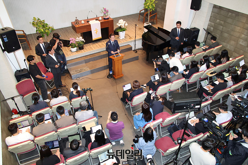 이재명 더불어민주당 대선 후보가 제21대 대통령 선거를 하루 앞둔 2일 오후 경기 성남시 성남주민교회에서 기자회견을 하고 있다. (경기 성남=서성진 기자)