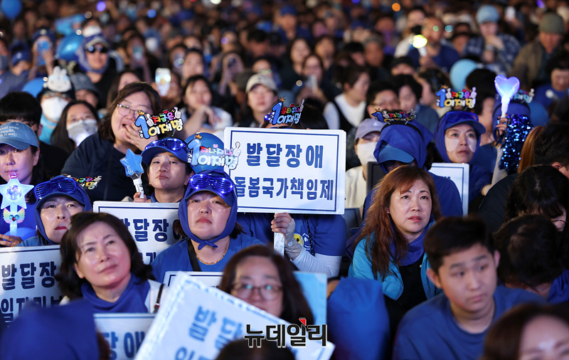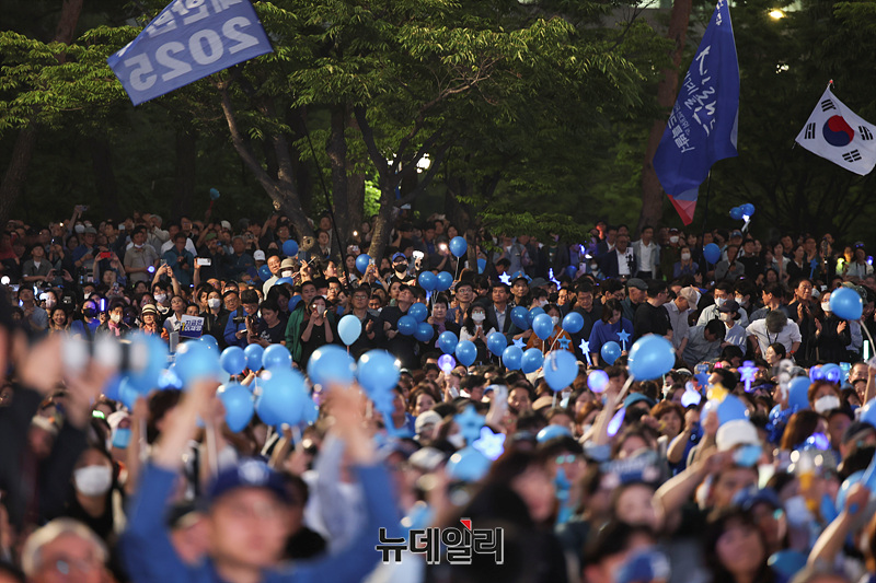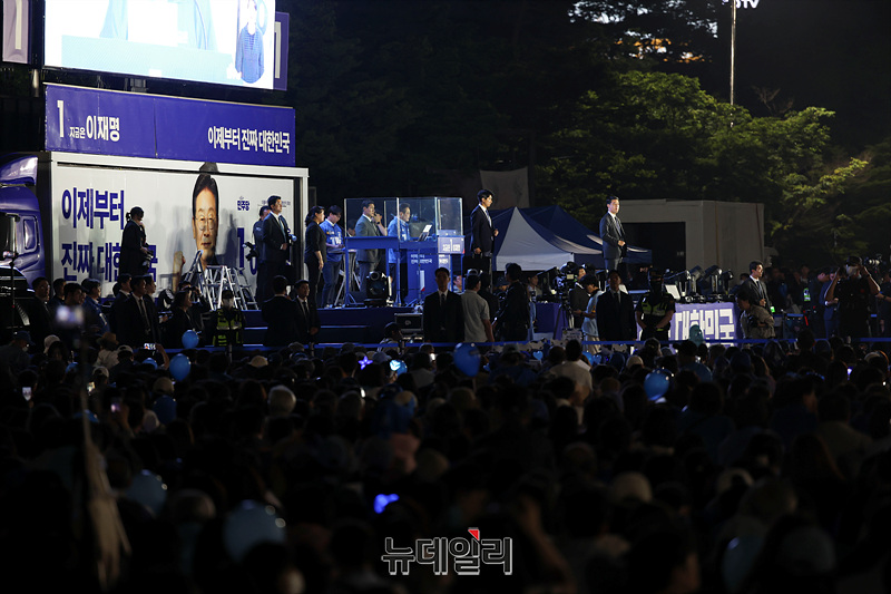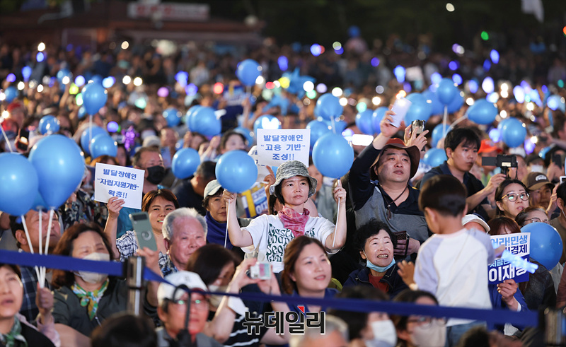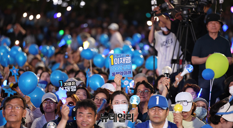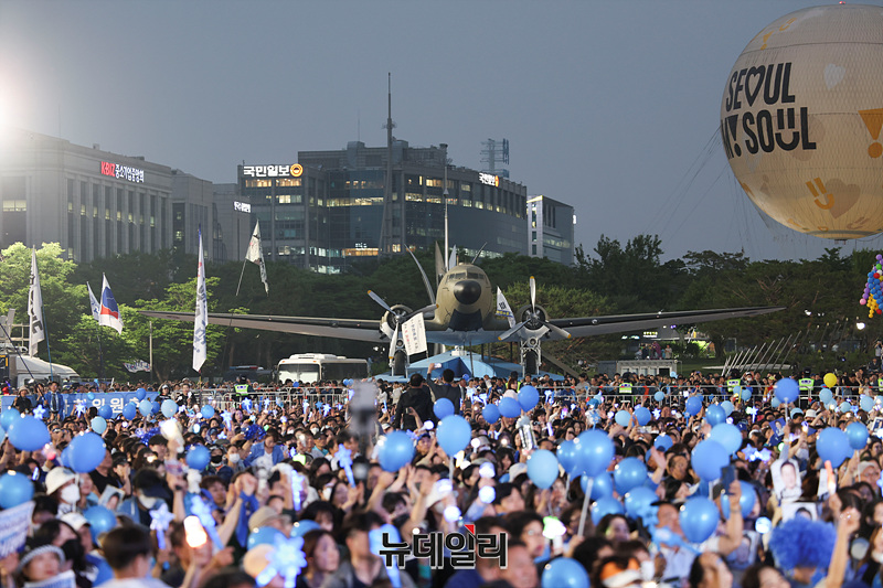 제21대 대통령 선거를 하루 앞둔 2일 오후 서울 여의도 공원에서 열린 이재명 더불어민주당 대선 후보 유세현장이 지지자들로 가득 차 있다.