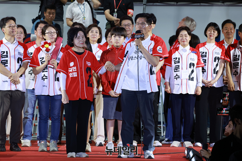 김문수 국민의힘 대선 후보가 제21대 대통령 선거를 하루 앞둔 2일 오후 서울광장에서 열린 피날레 유세에서 부인 설난영 여사의 손을 잡고 지지를 호소하고 있다.